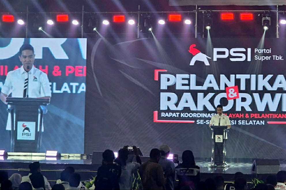 Kaesang melantik 71 orang kader DPW PSI Sulsel, beserta 24 ketua DPD PSI se-Sulsel, pada Pelantikan dan Rapat Koordinasi Wilayah (Rakorwil) PSI se-Sulsel-Sulbar, di Hotel Claro, Makassar, Rabu (28/1/2026).