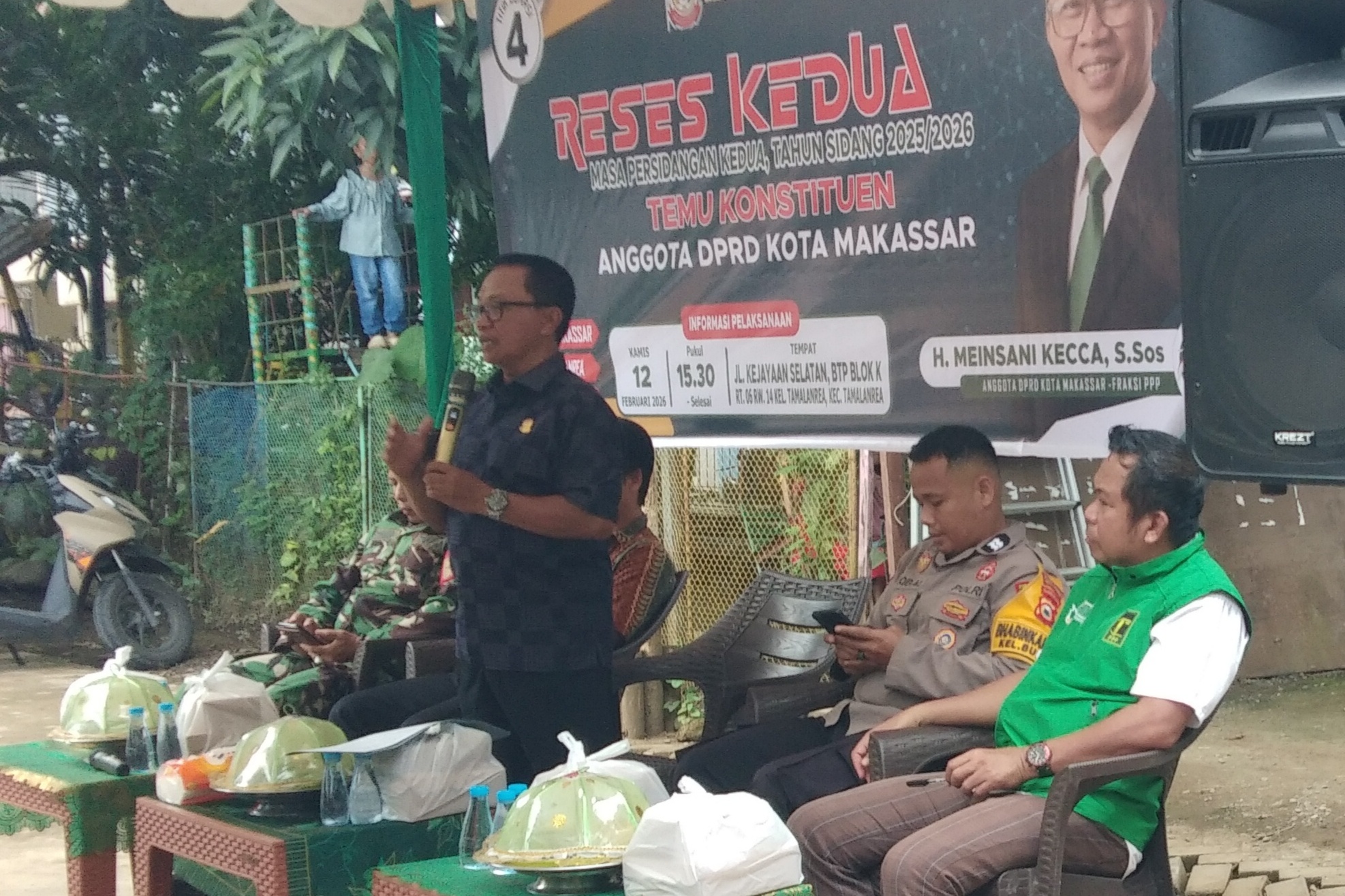 MAKASSAR, UPOS – Anggota DPRD Kota Makassar, H. Meinsani Kecca, S.Sos, menggelar Reses Kedua Masa Persidangan Kedua Tahun Sidang 2025/2026. Hal tersebut, dalam rangka temu konstituen di Jalan Kejayaan Selatan Blok K, Kelurahan Buntusu, Kecamatan Tamalanrea, RT 06 RW 14, Kota Makassar.