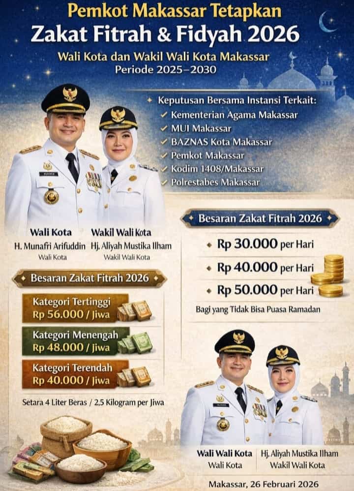 MAKASSAR, UPOS – Pemerintah Kota Makassar, bersama Badan Amil Zakat Nasional (Baznas), Majelis Ulama Indonesia (MUI) Kota Makassar, serta unsur terkait, telah bersepakat menetapkan besaran zakat fitrah dan fidyah, untuk wilayah Kota Makassar, pada Ramadan 1447 Hijriah/2026 Masehi.