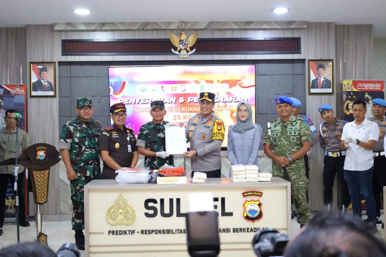 MAKASSAR, UPOS – Kepolisian Daerah Sulawesi Selatan (Polda Sulsel), melaksanakan pemusnahan barang bukti narkotika jenis kokain dengan berat bruto 25 kilogram di Mapolda Sulsel, Senin (16/3/2026).